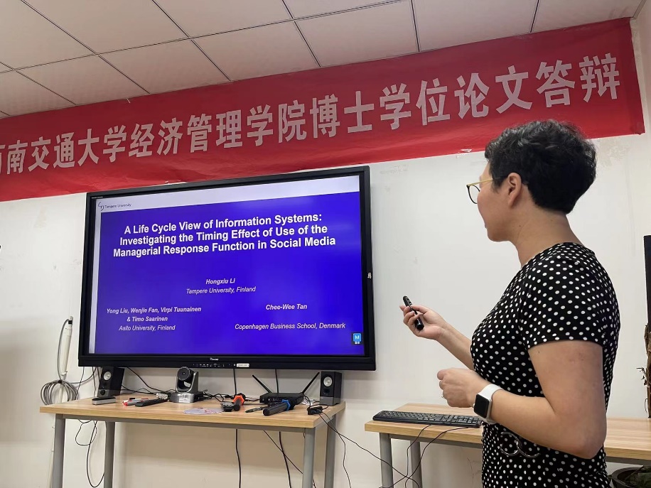 2023年9月15日上午9:30,芬兰坦佩雷大学管理与商业学院黎红秀副教授应邀为必赢官网师生进行题为“Dissipating the benefits of Information systems over time: Exploring the timing effect of customer-facing technologies”学术报告。本次学术活动由必赢76net官网市场系蒋玉石教授主持,学院部分老师和同学参与了此次学术活动。学院执行院长郭强教授对黎红秀副教授的学术成果进行了介绍,同时对黎教授的到来表示热烈的欢迎和感谢。