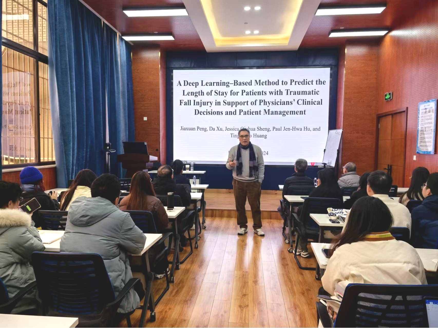 2024年12月13日上午,犹他大学胡仁华教授应邀为必赢官网师生带来一场题为“A Deep Learning–Based Method to Predict the Length of Stay for Patients with Traumatic Fall Injuries in Support of Physicians’ Clinical Decisions and Patient Management”的学术讲座。本次学术活动由学院副院长马锋教授主持,学院部分教师及研究生40余人参加此次学术活动。副院长马锋介绍了胡仁华教授的学术背景与成就,并对胡教授的到来表示热烈欢迎。