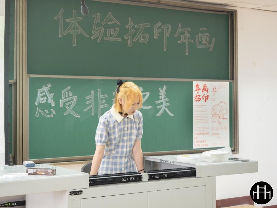 为让同学们更好的亲近非遗文化——绵竹年画,提升活动的效果。活动伊始,项目组成员提前布置好拓印工具并向在场同学介绍了木板年画的历史渊源、制作工艺与流程,随后还现场演示了拓印的过程。