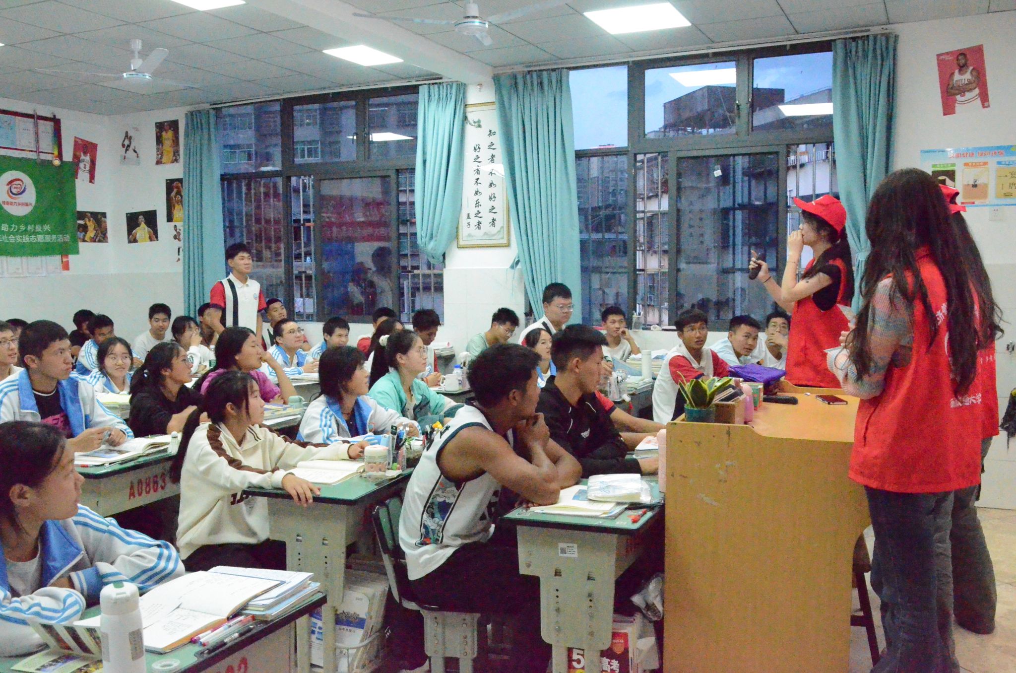 当夜幕降临,热情不减的队员们踏入会东中学高三七班的教室,开展普通话线下培训,并为高考加油助力。