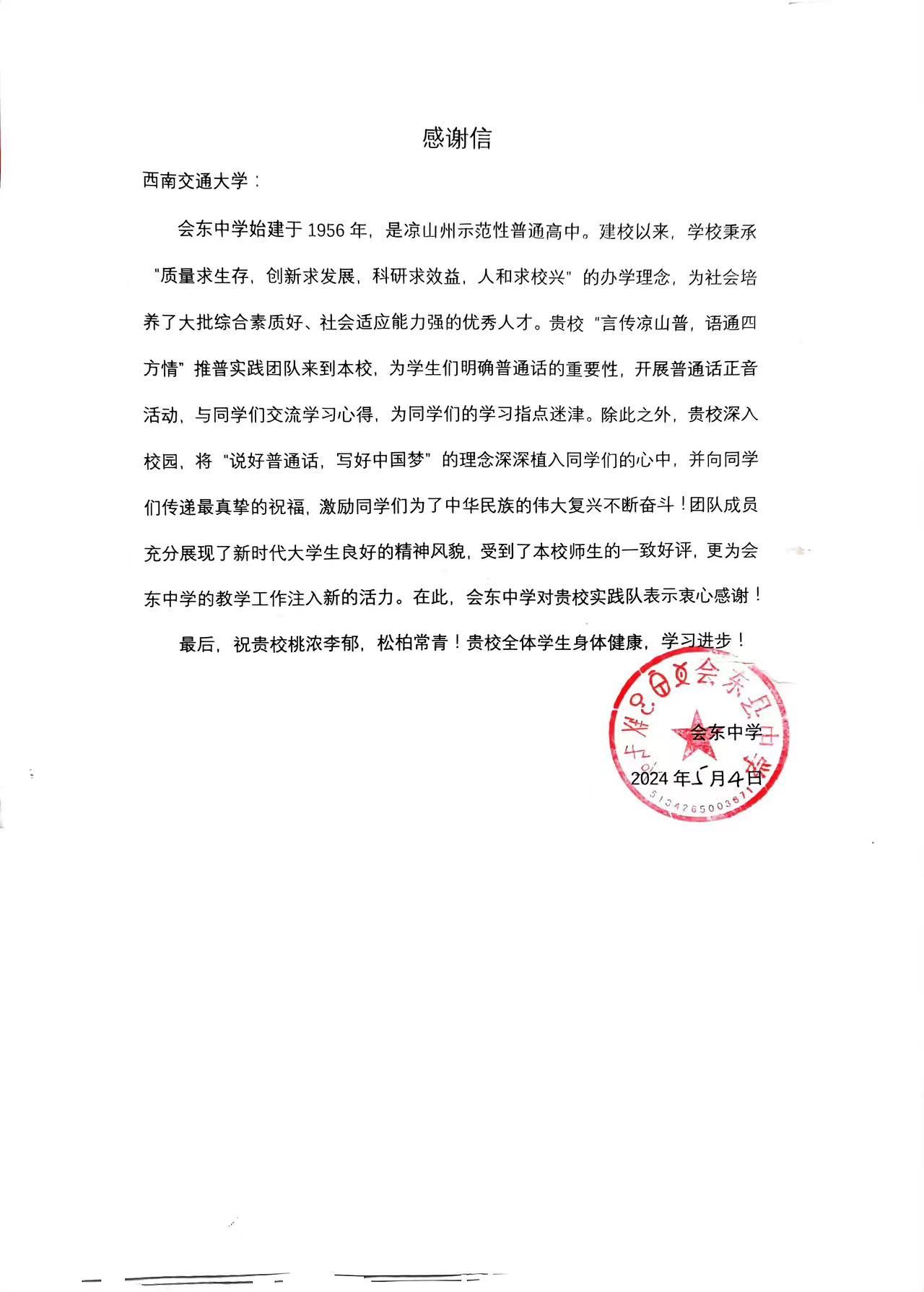 此次实践活动,队员们怀揣热忱,深入基层,致力于国家通用语言文字推广,为语言文字普及教育添砖加瓦,同时也为乡村振兴注入了青春的活力。活动得到了当地政府、群众的高度评价和热情支持。活动结束后,实践团队收到了来自会东中学的感谢信。
