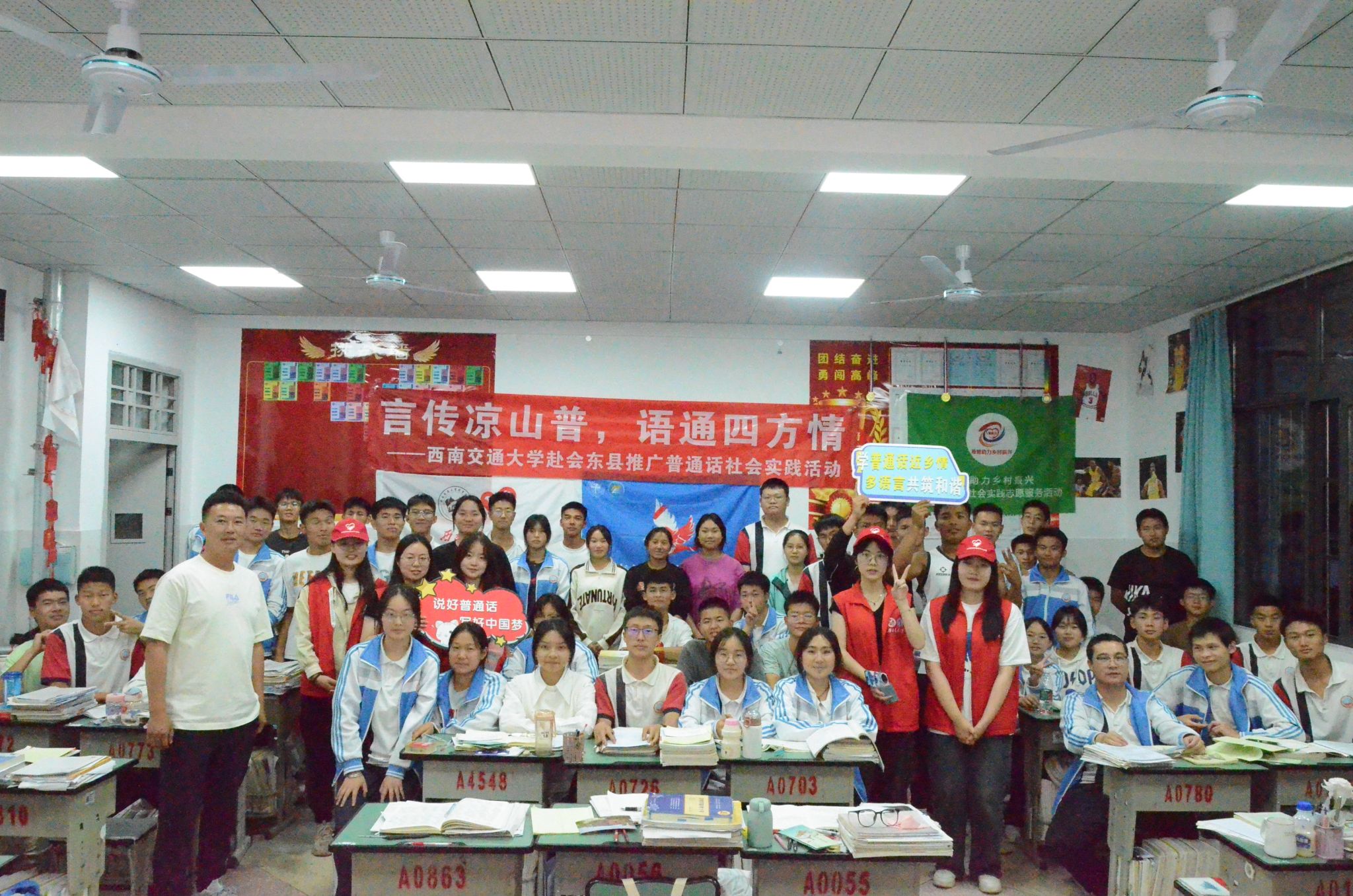 为深入贯彻落实习近平总书记关于教育的重要论述和关于语言文化的重要指示批示精神,进一步推动西部地区少数民族语言文字教育发展,服务铸牢中华民族共同体意识,助力乡村振兴战略实施,5月2日至5月4日,西南交通大学必赢76net官网青鸽志愿服务队一行深入四川省凉山彝族自治州会东县,开展“言传凉山普,语通四方情——推普助力乡村振兴”社会实践活动。在此次实践中,团队通过街头调研,定点摊位,课堂教育,走访宣传等形式,开展普通话调研和推广活动,普及民族共同语言,促进中华优秀语言文化传承和发扬,为赓续中华文明倾注青年力量,以青春之行助力乡村振兴。