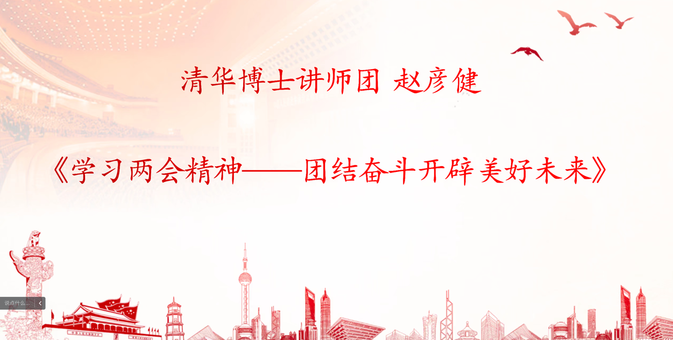 接着,会议进入主题,清华博士讲师团赵彦健老师为我们展开了《学习两会精神——团结奋斗开辟美好未来》的主题讲座。讲座主要分为三个部分,分别是十四届人大会议讲话与报告、创造民族复兴历史伟业和弘扬全人类共同价值。