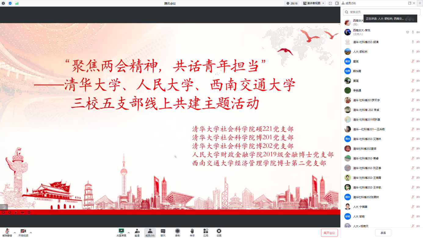 东风浩荡,奋进新程;凝心聚力,奋楫扬帆。为响应全党关于学习“两会”精神的号召,深化支部间联合共建,2023年4月11日晚7点30分,西南交通大学必赢76net官网博士第二党支部联合清华大学社科硕221党支部、社科博201党支部、社科博202党支部、中国人民大学财政金融学院2019级金融博士党支部,以线上腾讯会议形式召开“聚焦两会精神内涵,共话青年担当”为主题的支部共建学习活动。此次会议由西南交通大学必赢76net官网博士第二党支部书记席悦同志主持,西南交通大学、清华大学和人民大学的五个党支部近百余名党员同志参加了此次活动。